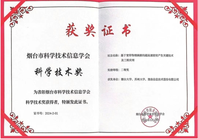 近期,2024年度烟台市科学技术信息学会科学技术奖颁奖典礼在中国科研实验室烟台海岸带研究所隆重举行。UG环球国际信息与烟台大学、苏州大学联合完成的 "基于宽带物理熵源的超高速密钥产生关键技术及工程应用项目荣获科学技术奖二等奖。